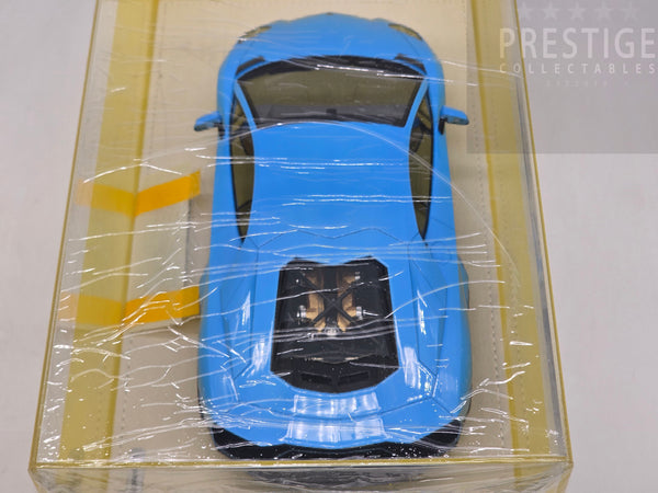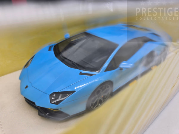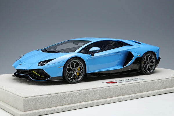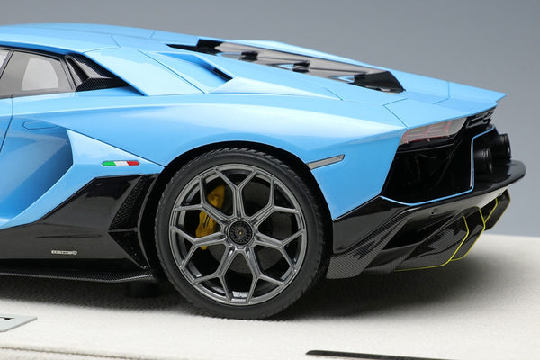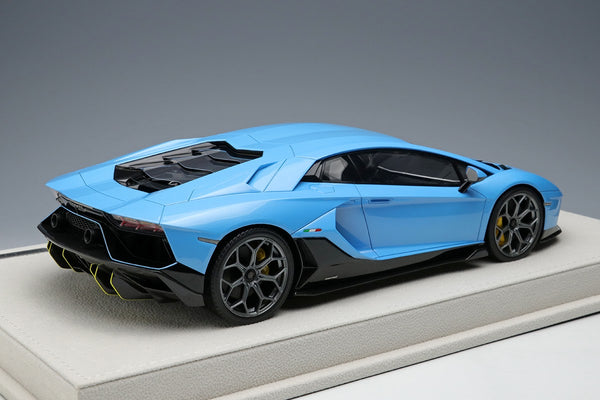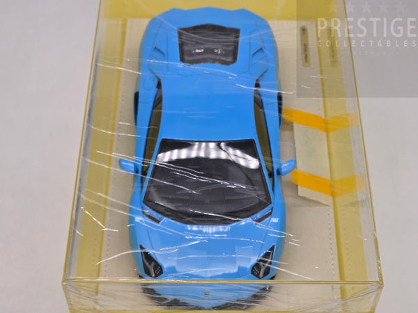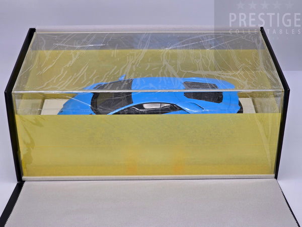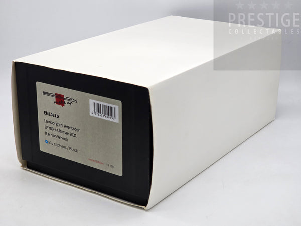 This brand new and unopened example is a 2021 Aventador Ultimae LP780-4 finished in Blu Cepheus with a Nero Ade interior, yellow brake calipers and the SVJ Leirion forged wheels. Like all Make Up / Eidolon models the car has been finished in incredible detail with this example presented on a suede base with a suede cloth, showcase and limited build plate.